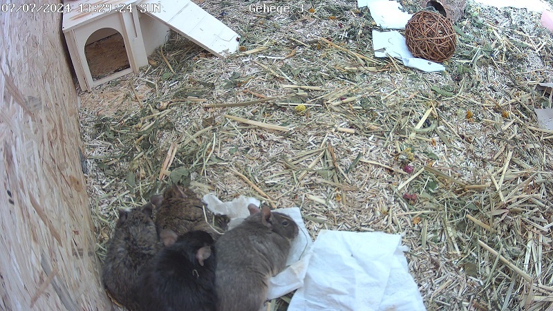 Den Finalen Showdown gab es dann am 28. Juni. Dagmar schaltete sich gegen 14:30 per Video zu und daraufhin wurden die Transportboxen nacheinander geöffnet. Zuerst Jacky und Diabolo. Nachdem die beiden aus Ihrer Box geklettert sind wurde auch direkt die Box von Chip und Chappy geöffnet. Nachdem alle aus Ihrer Box waren, wurden diese weggeräumt und es kam auch hier schon zu den ersten Rangeleien. Diese verliefen erstaunlich Ruhig und gesittet ab und fliegende Degus gab es auch nicht. Nach ca. 90 Minuten meinte Dagmar, dass da nun weiter nix wildes mehr geschieht und ich nun den Raum verlassen könne indem die VG stattfand. Also verließ ich mitsamt Laptop das Bad und Dagmar und ich plauderten noch ein wenig, während wir über die Kameras die Jungs weiter im Auge behielten. Nachdem wir unser Gespräch beendet hatten legten sich auch die Jungs gegen 17:00 Uhr hin um ein Ausgedehntes Nickerchen zu machen. Hier gab es schon mal einen kleinen Teilerfolg. Beim ersten Schläfchen lagen Chip und Chappy zusammen sowie Jacky und Diabolo. Letztere Kombination überraschte mich ein wenig, da die beiden während der gesamten VG-Zeit das Trenngitter mieden.