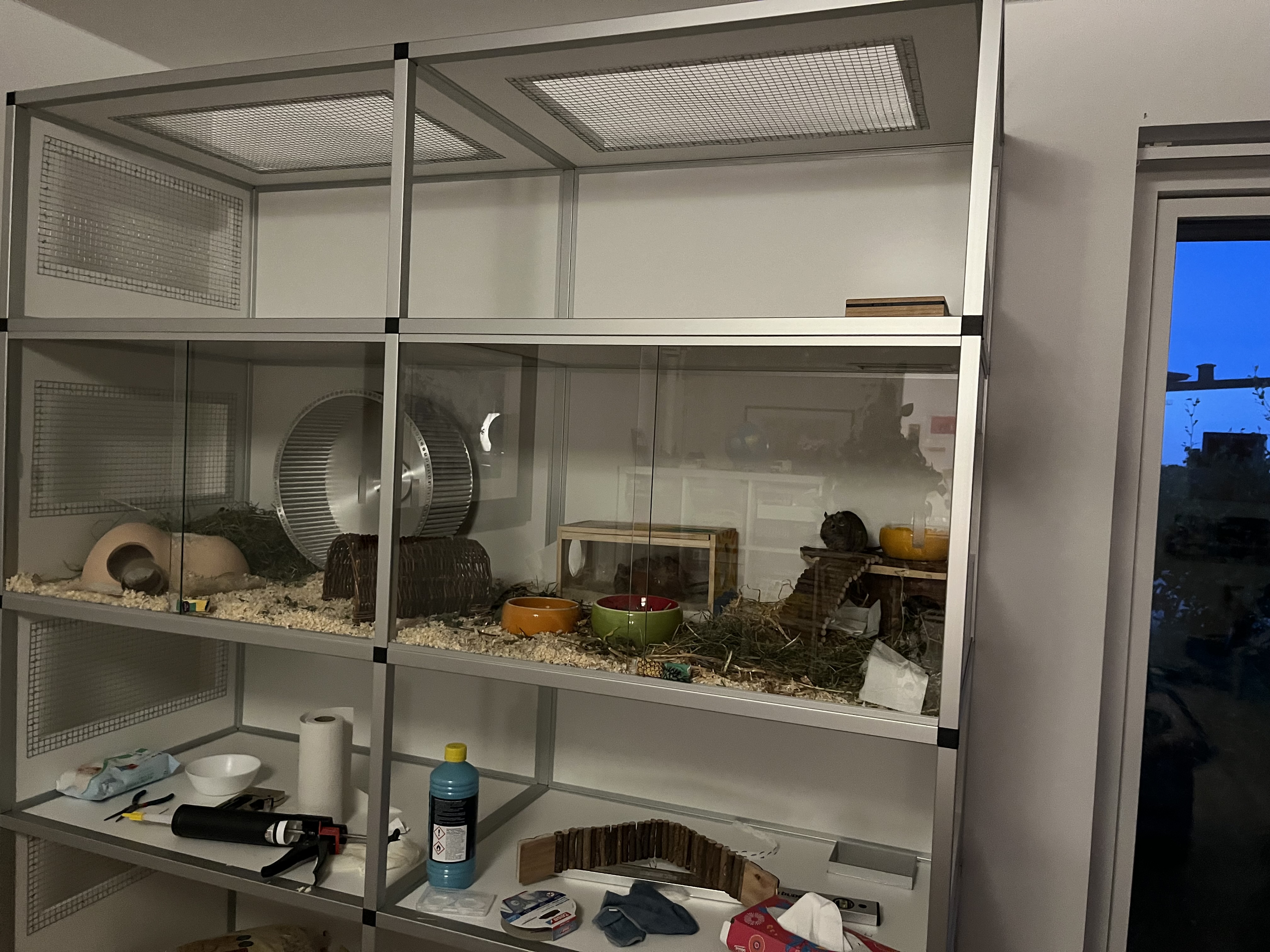 E-Profile hatte ich bereits vorher reingeklebt (eigentlich wollte ich das erst mit den Glasscheiben zusammen machen, um keine böse Überraschung zu erleben). Die Sperrholz- und Acrylglasplatten standen dann halt unbenutzt daneben. (Aus den ersteren werde ich dann irgendwann Häuschen bauen.) Und die letzte Woche habe ich dann nach und nach die Streuschutzgläser mit Silikon eingeklebt und so die Etagen erweitert.