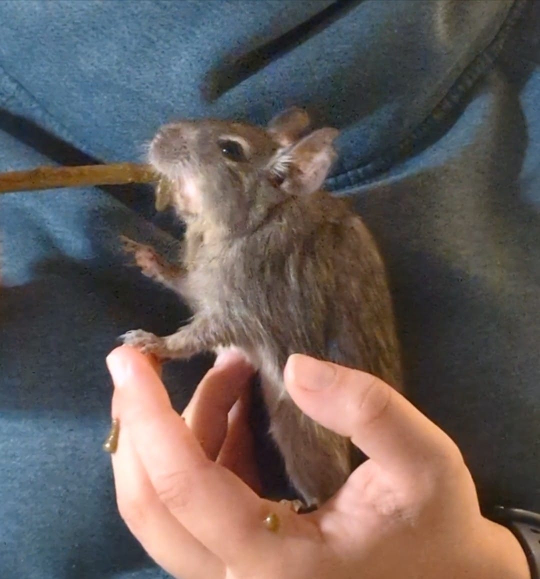 Begonnen haben wir dann mit Novalgin, weil es eben doch stärker ist. Nachdem ich damit aber einen Zombiedegu im Käfig sitzen hatte, bin ich schnell wieder beim Melosus gelandet. Damit hatte Ida dann auch wieder Appetit.