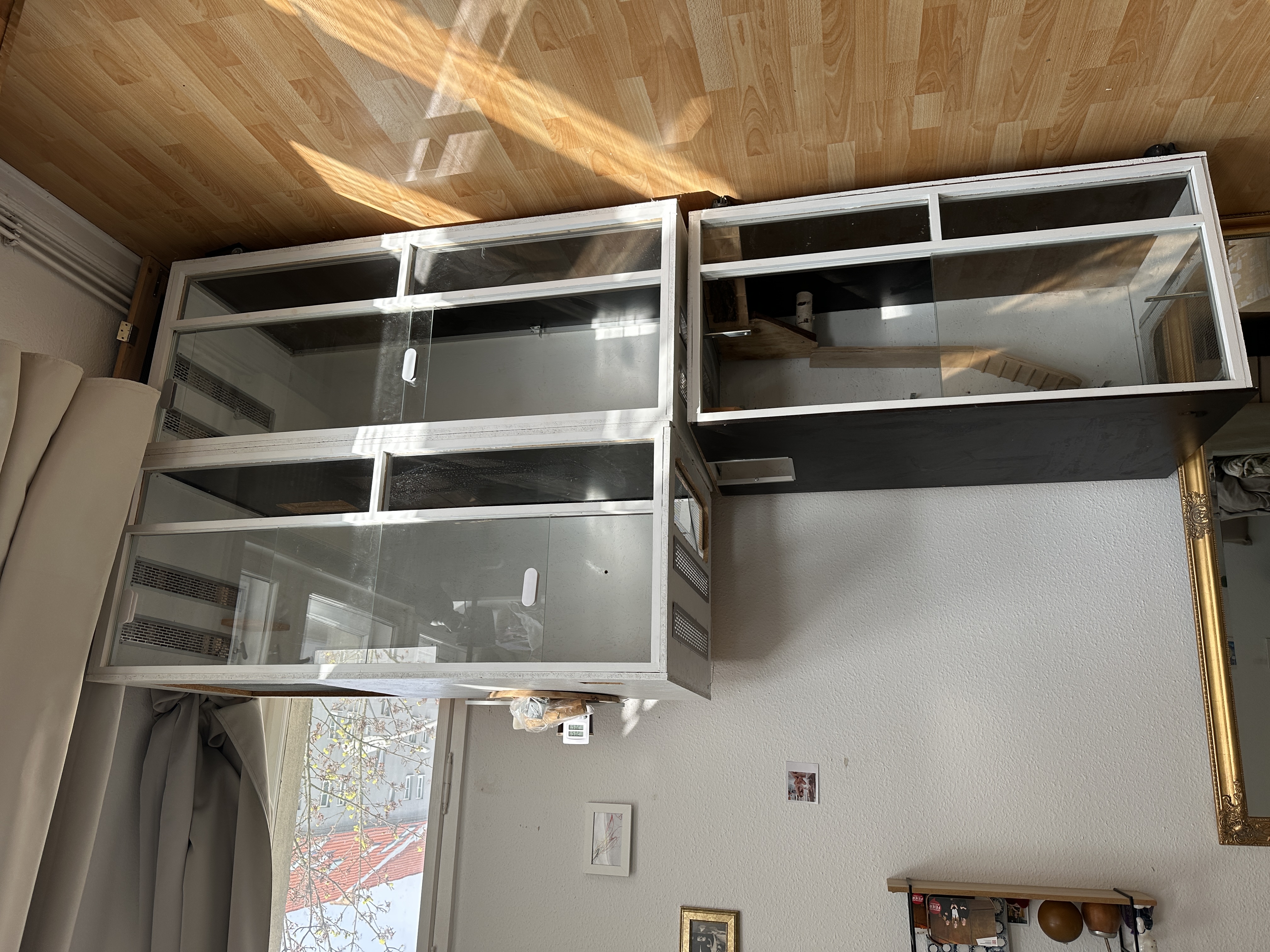 Alle Böden und Zwischenebenen bestehen aus Siebdruckplatten, die leicht zu säubern vor Urin sind.