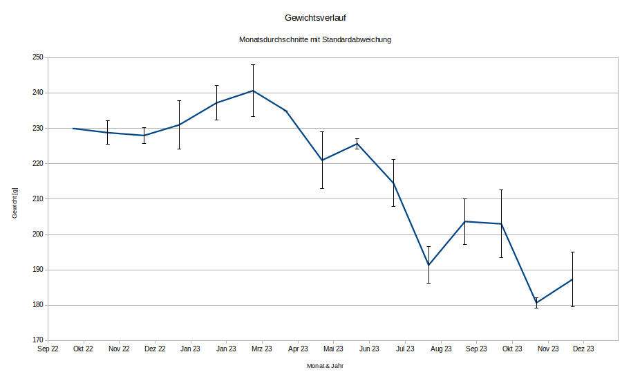 Sein Gewicht hingegen fährt Achterbahn. Während er noch vor einem Jahr einigermaßen stabil um die 230g pendelte, sind wir aktuell bei großen Schwankungen um die 190g. Nur 14 Tage später.. schwupps 15g weniger.