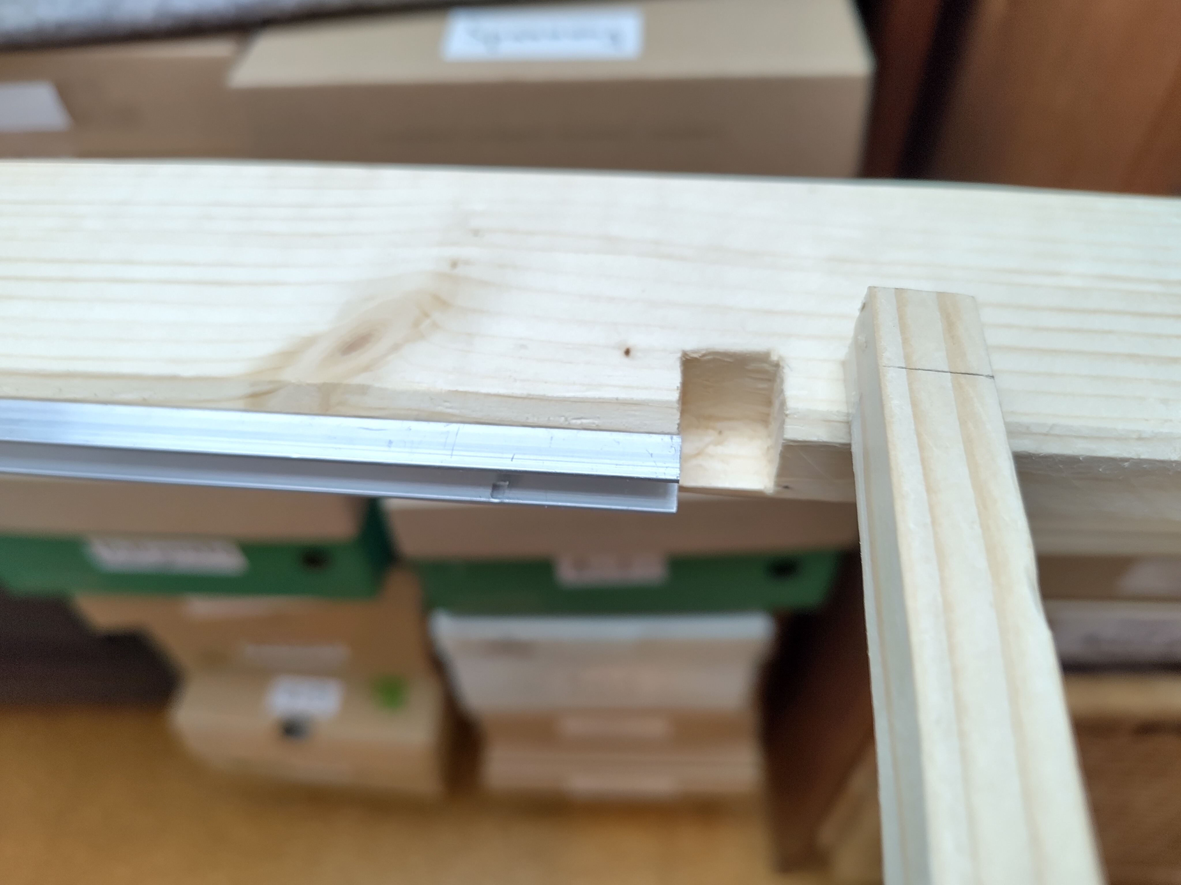Die Alu-U-Profile habe ich auf die richtige Länge gesägt, mit einem großen Metallbohrer Vertiefungen für die Schraubenköpfe sanft reingefräst und mit einem kleinen Bohrer dann das Loch gebohrt. Im Rahmen mussten dann noch kleine Aussparungen für Mittelstäbe gestemmt werden. Hier haben mir neben den Stechbeiteln, der kleine Grundhobel und die japanische Säge geholfen.