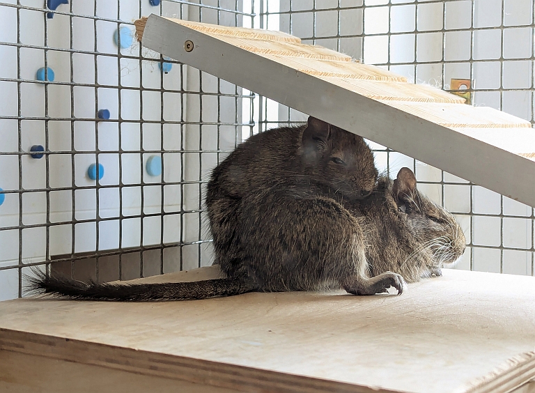Vielleicht muss die kleine Linn noch lernen, wie sich ein Degu-Madl benehmen muss und Shepard versucht es ihr, beizubringen, Und bestimmt hat die kleine Linn noch viele Flausen im Kopf. Degu-Erziehung eben ...