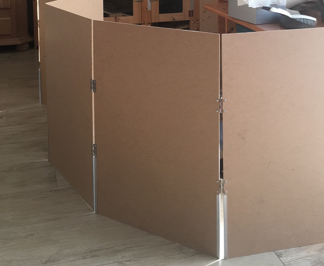 Wir hatten einen zusammenklappbaren Schutz für den Auslauf aus HDF Platten 3mm dick und ich glaube 70 cm Höhe x 50 cm Breite. Mit angebrachten Scharnieren zum Zusammenklappen sowie im unteren Bereich Aluleisten als Knabberschutz.
