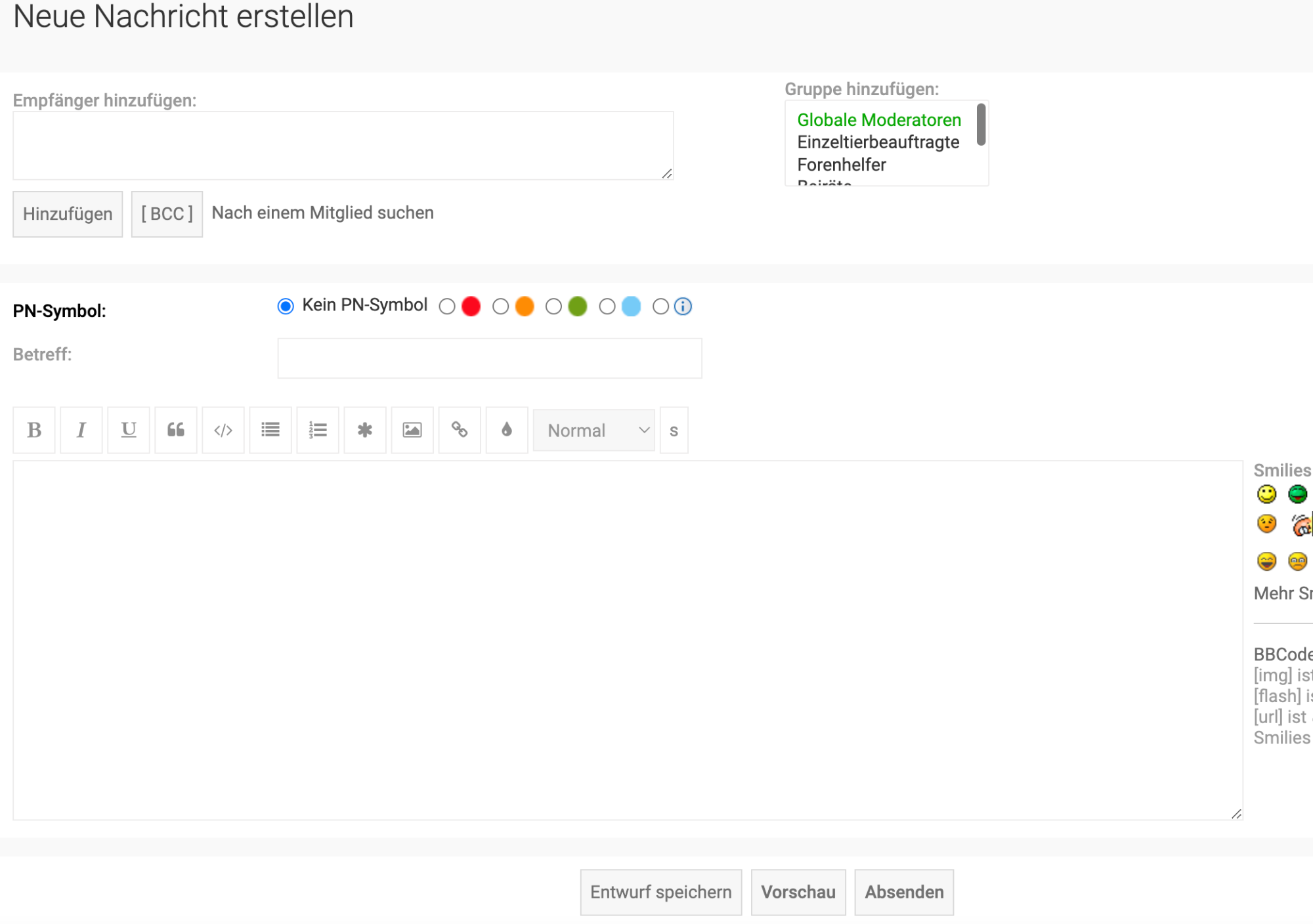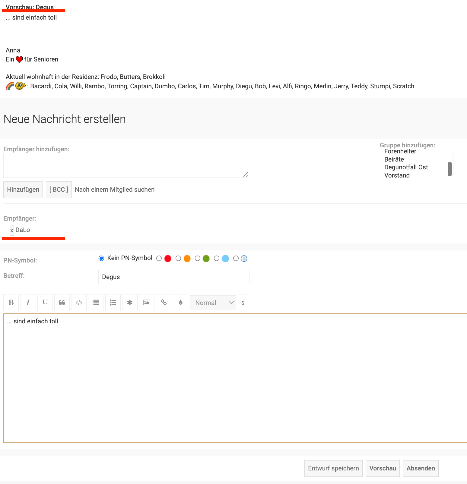Ich möchte eine neue Nachricht erstellen. Dann sieht mein Fenster so aus: Nun muss ich noch einen Nutzer hinzufügen. Klugerweise habe ich mir diesen (DaLo) vorher notiert und trage ihn in das entsprechende Feld ein: Würde ich nun direkt auf Absenden klicken, kommt folgendes: im Ganzen: Hier seht ihr, dass "DaLo" als Empfänger eingetragen wurde, und dass es eben nur eine Vorschau ist.
