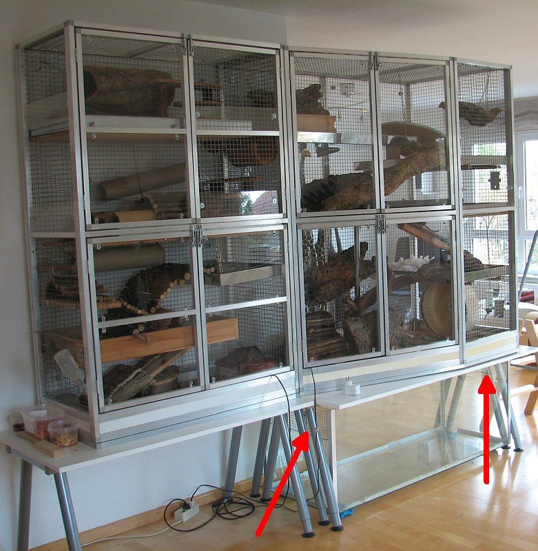 Als Aufsatz könnte man z.B. das SAVIC Nagerheim Suite Royal XL (https://www.dehner.de/produkte/savic-na ... d=79624256) umbasteln und müssten eine Lösung für den Übergang von Gitter zum Terrarium finden.