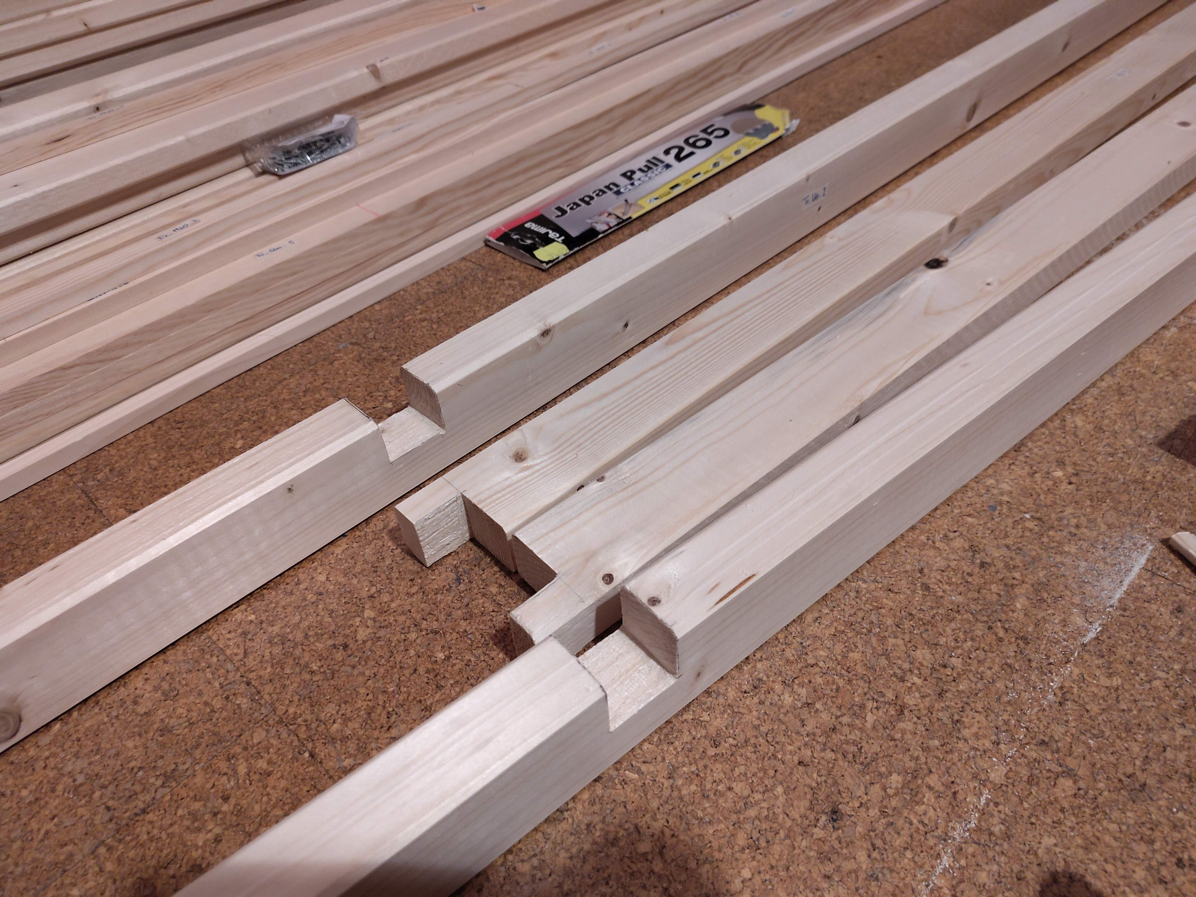 Heute wurde maßgeblich ganz viel angezeichnet. Mit der Hauptsägearbeit beginne ich morgen, wenn ich die Kappsäge meiner Schwester habe. Mit meiner Katabasäge ist mir das zu anstrengend in der Menge. Dafür habe ich für die waagerechten Tragrahmenverbinder Aussparungen mit dem Stechbeitel ausgearbeitet. T-Verbindungen lassen sich ja nichr so gut schrauben. Und so hält es mit Presspassung und einer Schraube von unten bombenfest.