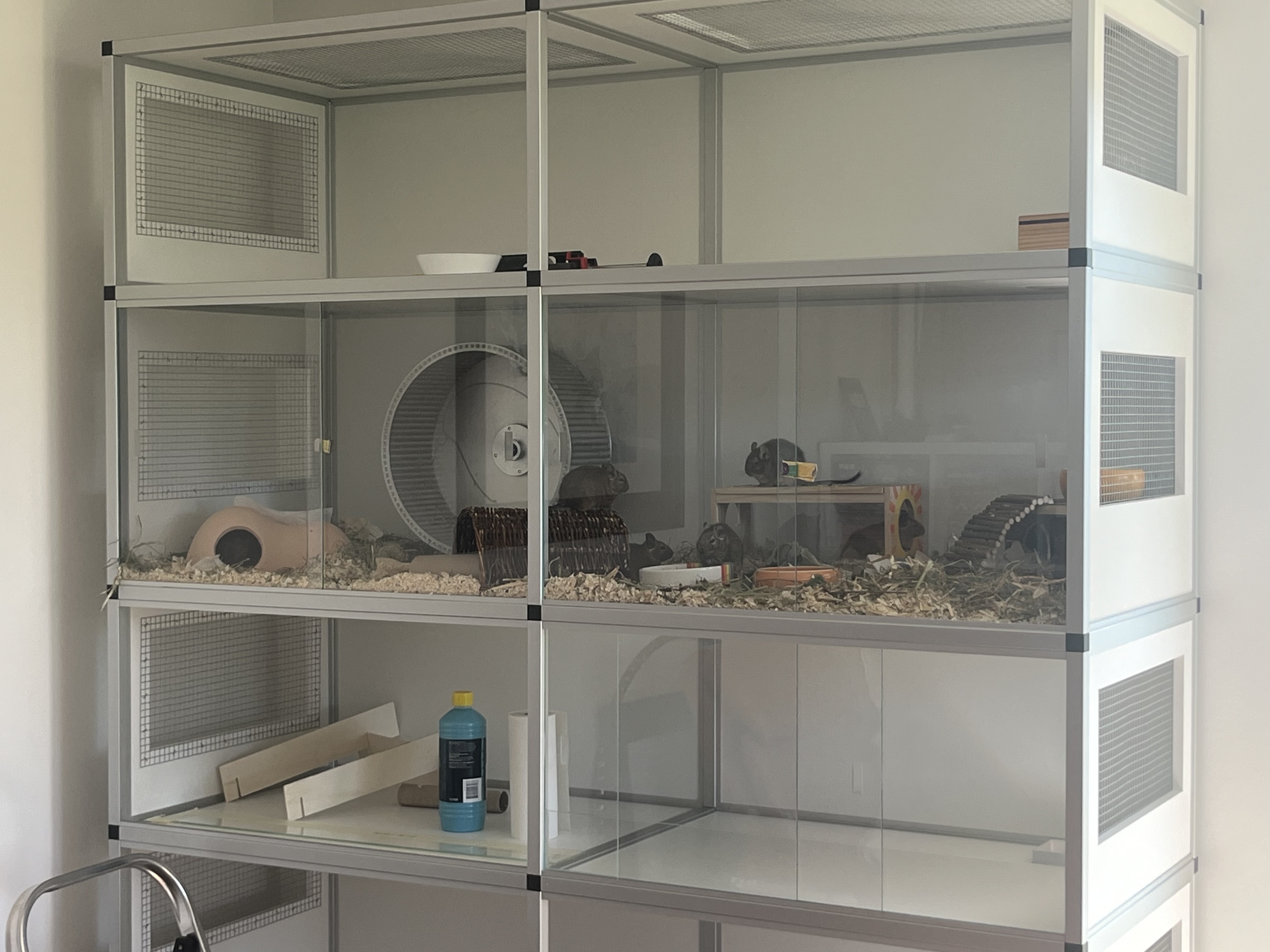 - absolute Mindestkäfiggröße für 2-3 Degus: 130 x 60 x 130 cm (L x B x H in cm), große Grundfläche bzw. Laufmöglichkeiten besonders wichtig, daher auch große Etagen.
