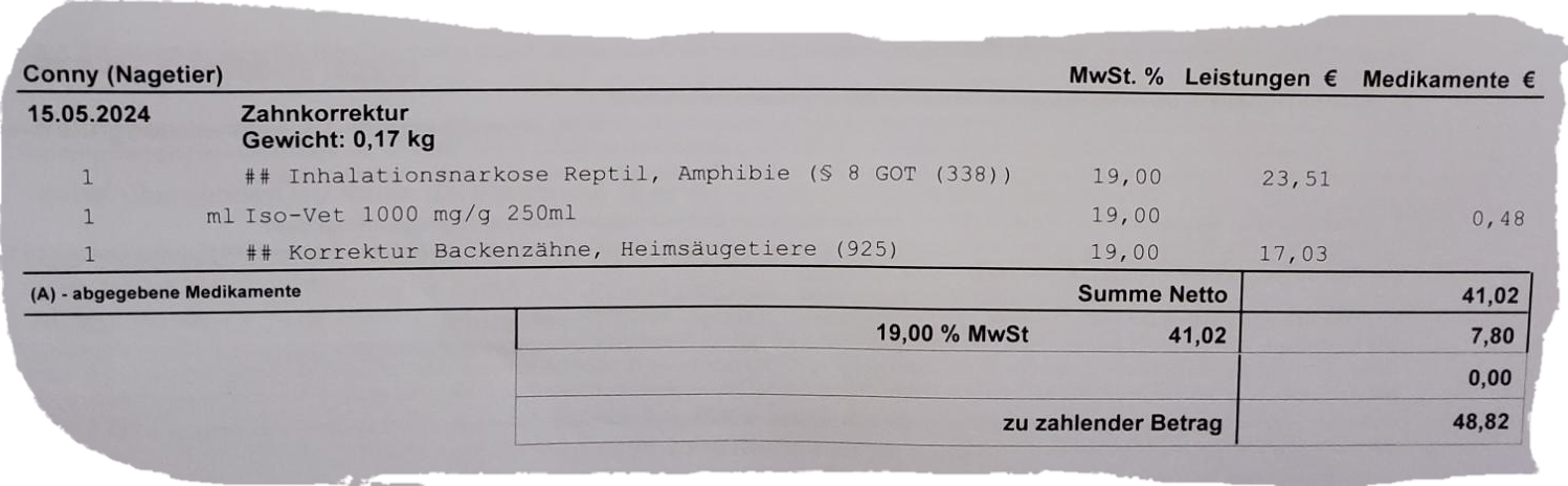 Inzwischen ist auch die Kleintierhaltung teils kostenintensiv... und morgen gleich nochmal, super. Gute Besserung der kleinen PatientIn!