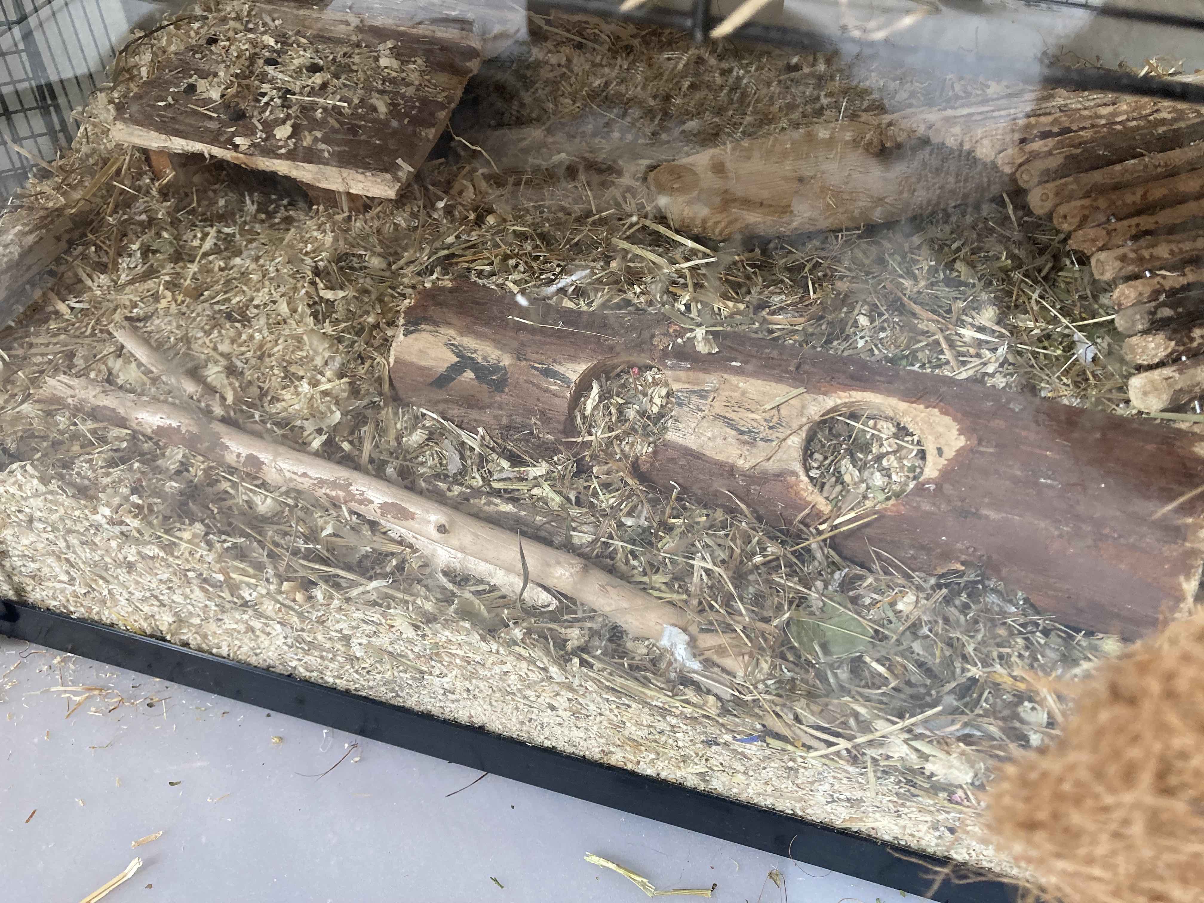 Zu den Kleinen: Sie kommen schon hin und wieder aus dem Nest, aber ich hab sie bisher völlig in Ruhe gelassen, noch nicht reingefasst und keins rausgeholt etc. Man sieht wenn man sich davor kniet aber sehr gut rein, u.a. mit einer sanften Taschenlampe. Dummerweise haben alle sechs die gleiche Farbe - Agouti, wie die Eltern - sind also nicht auseinanderzuhalten optisch. Ich würde das am Wochenende mal machen und Fotos machen und wäre euch SEHR dankbar für Hilfe bei der Geschlechterbestimmung! Sie sind im Häuschen im Einstreu links unter der Holzetage, also auf dem Foto verdeckt.