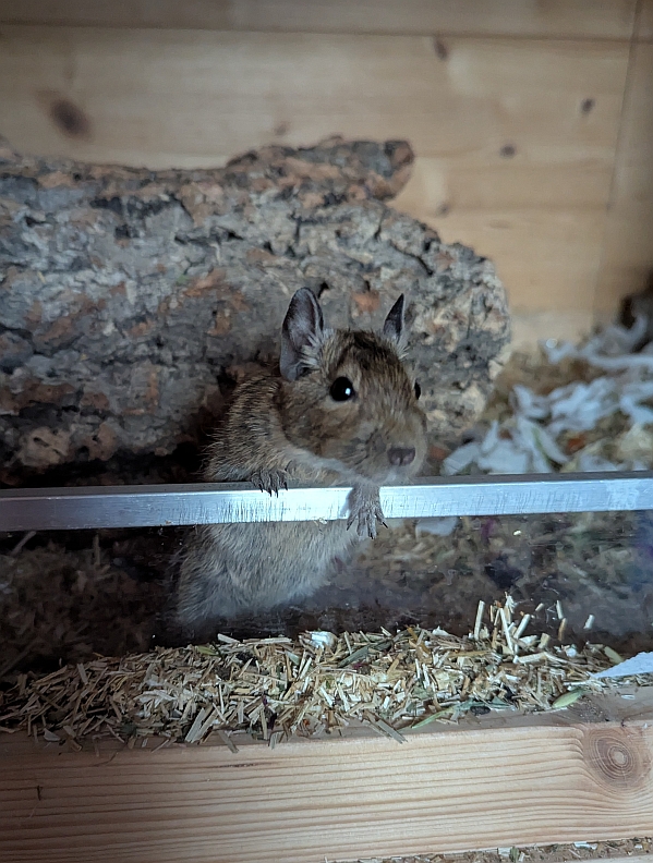 Es freut mich dennoch sehr, dass sie so aufgeweckt und zutraulich ist und dank Deiner guten Pflege, Dagmar, alle körperlichen Wunden aus ihrer Vorzeit gut verheilen. Ich drücke Euch die Daumen, so dass Linn eines Tages auch mit anderen Degus zusammenleben kann, diese als Freunde akzeptiert und ebenso auch dann akzeptiert wird.