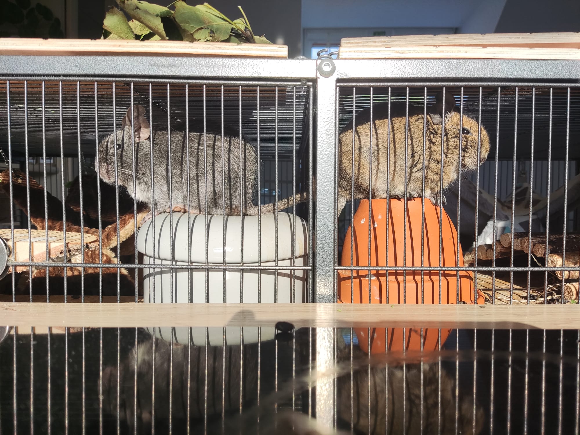 Wir machen einmal die Woche einen Seitenwechsel und wechseln, bzw vermischen, alle paar Tage den Sand aus ihren Sandbädern. Die Seitenwechsel sind für die beiden relativ aufregend und sie brauchen in der Regel 1-2 Tage, um sich mit ihrer neuen Hälfte zu arrangieren. Inzwischen haben die beiden aber schon so häufig Seiten getauscht, dass der gesamte Käfig nach beiden Jungs riecht und es kein merkliches Territorialverhalten gibt.