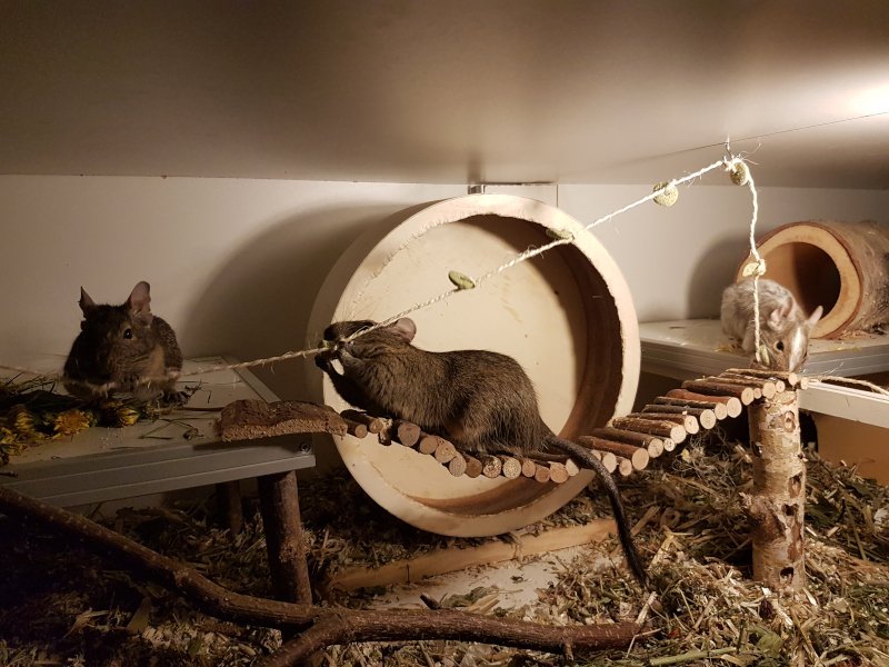 oder die Nüsse einzeln dann aufhängen, senkrecht nach unten an einzelnen Haken/Ästen oder dergleichen, dann kann sich jeder um eine andere Nuss kümmern