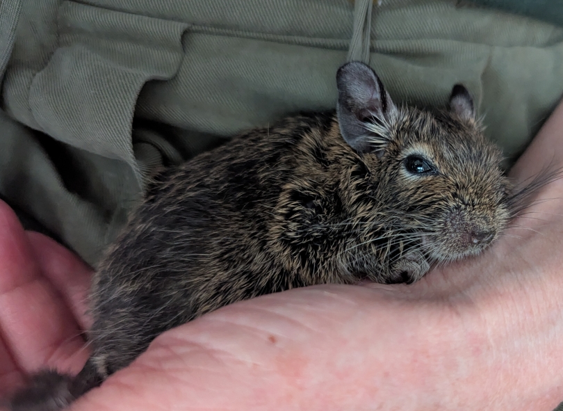 Sie beißt nicht mehr in alles, was sie vor die Schnauze bekommt und die Koordination wird immer besser. Zerrupft sieht sie weiterhin aus und sie quäkt die meiste Zeit des Tages lautstark.