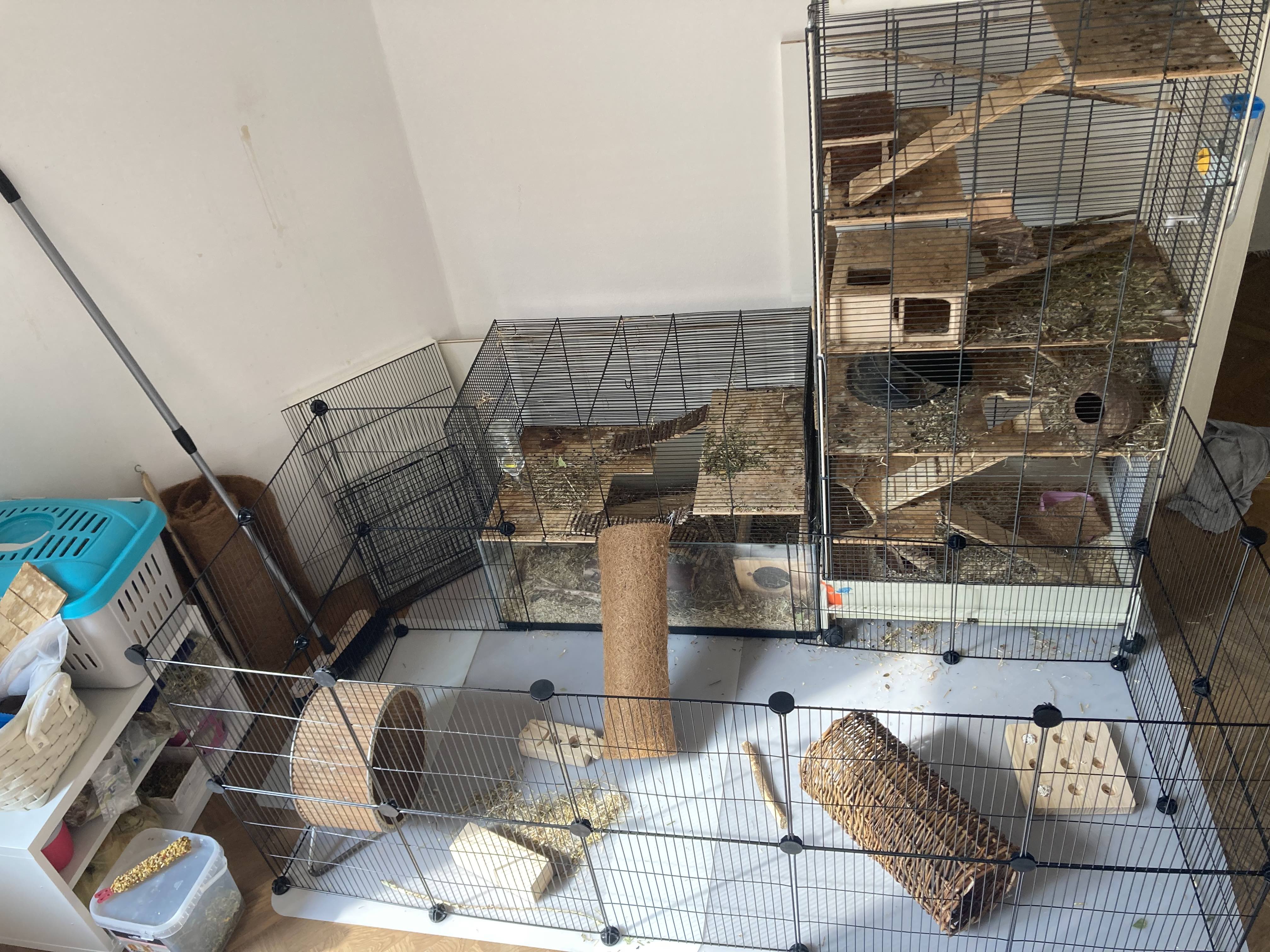 Zum Käfig: Wir haben zwei, die wir aufeinandergestellt haben, mit unten einem Glasrandbereich mit Einstreu, und dann sieben Ebenen. Dazu haben wir davor ein Außengehege gebaut, in das die beiden tagsüber auch immer frei können. Da die Mama ihre Babys unten im Häuschen in der Einstreu bekommen hat, haben wir dann den oberen Käfigteil abgesperrt, als der Papa oben war, und den Käfig dann am nächsten Tag danebengestellt - jetzt können sie sich auf einer Ebene sehen und riechen. Ins Außengehege, das wir um besser an die Käfige zu kommen gerade auch etwas reduziert eingerichtet haben, lassen wir sie aktuell abwechselnd, aber bald wird das dann vermutlich den Kleinen vorbehalten sein, die im linken, unteren Käfigteil sobald sie aktiv sind sicher viel zu wenig Platz haben. Es wäre kein Problem für uns, völlig umzubauen, wenn wir noch zwei behalten. Entweder ich suche noch einen dritten ähnlichen Käfig dazu, den wir irgendwie integrieren, oder, das hab ich auch schon überlegt, wir bauen langfristig einen Schrank um, dann würde auch nicht seitlich immer so viel rausfallen. Foto ist anbei. Sieht kleiner aus weil ich mich auf einen Stuhl gestellt habe, um alles draufzukriegen. Der rechte Käfig ist 160 cm hoch und 65 breit, der linke kleinere ist 80 breit und 70 hoch. Übereinandergestellt mit Durchgang hatten sie dann eine Ebene mehr (auf der Holzbretter lagen und das zweite Laufrad stand), ich hatte auch hinten und an einer Seite eine kleine Rückwand von außen drangebaut zur Gemütlichkeit und damit weniger rausfällt. Plus das Außengehege mit 180x80 cm.)