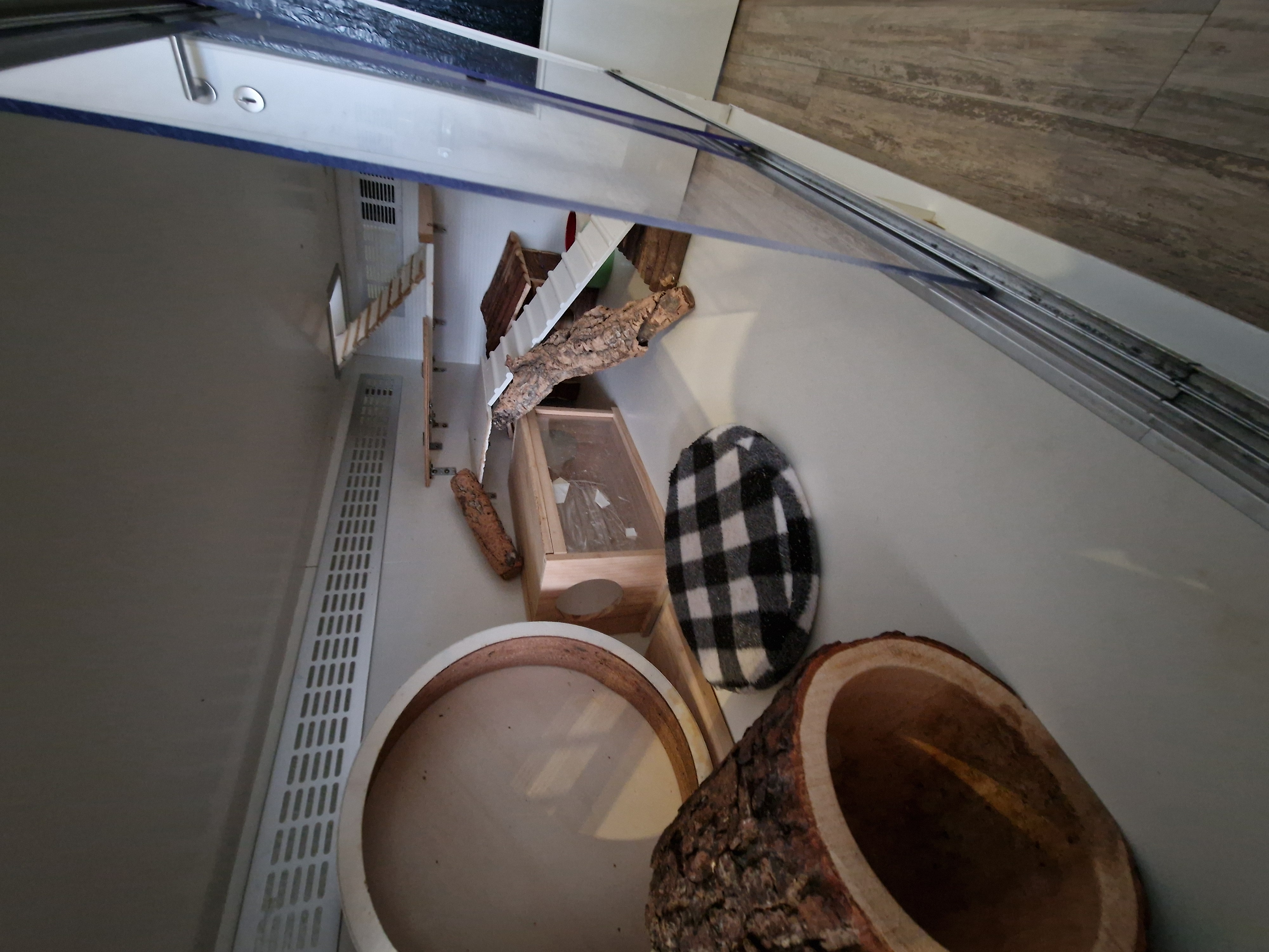 Leider sind vor paar Wochen in kurzen Abstand meine letzten Degus gestorben und nach reiflicher Überlegung habe ich mich dazu entschlossen in naher Zukunft keine neuen aufzunehmen auch aus gesundheitlichen Gründen. Der Käfig ist selber gebaut und auf Rollen kann also frei bewegt werden.