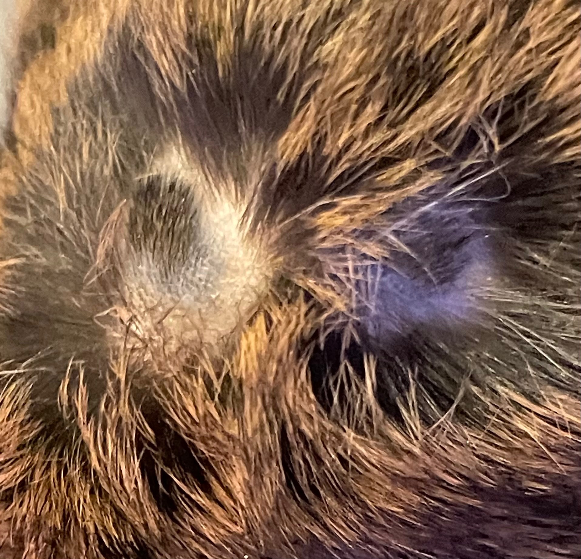 Das Dunkle ist nicht die Hautfarbe, sondern nachwachsendes Fell. Bin da bei Dagmar. Für mich sieht es unspektakulär aus (bspw. übetriebene Fellpflege durch Patnertier oder Folge eines Spot ons), aber TA ist sicher ne gute Idee.
