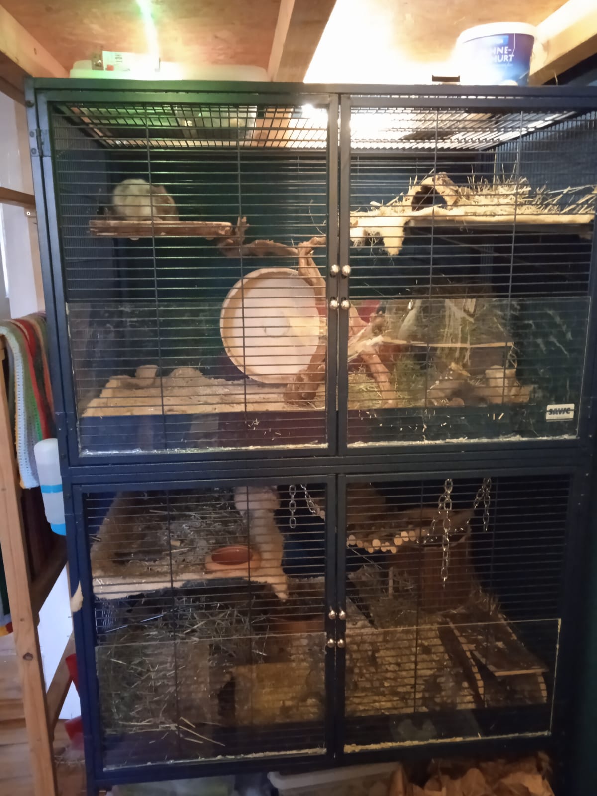 Das mit dem Käfig habe ich gehört - zu klein, zu wenig Lauffläche. Selbstverständlich nehme ich mir das zu Herzen und werde mich zügig um eine Verbesserung dessen kümmern. Da Wiederrum entsteht jedoch bei mir die nächste Sorge - wenn wir (so wie wir es nun schon Falsch gemacht haben) alles so belassen sollen, wie es ist und möglichst wenig versetzen sollen, wie sollen wir denn das mit dem 'Umbau' machen? Streu und Gerüche würden bleiben, jedoch alles müsste versetzt werden. Habt ihr Tipps?