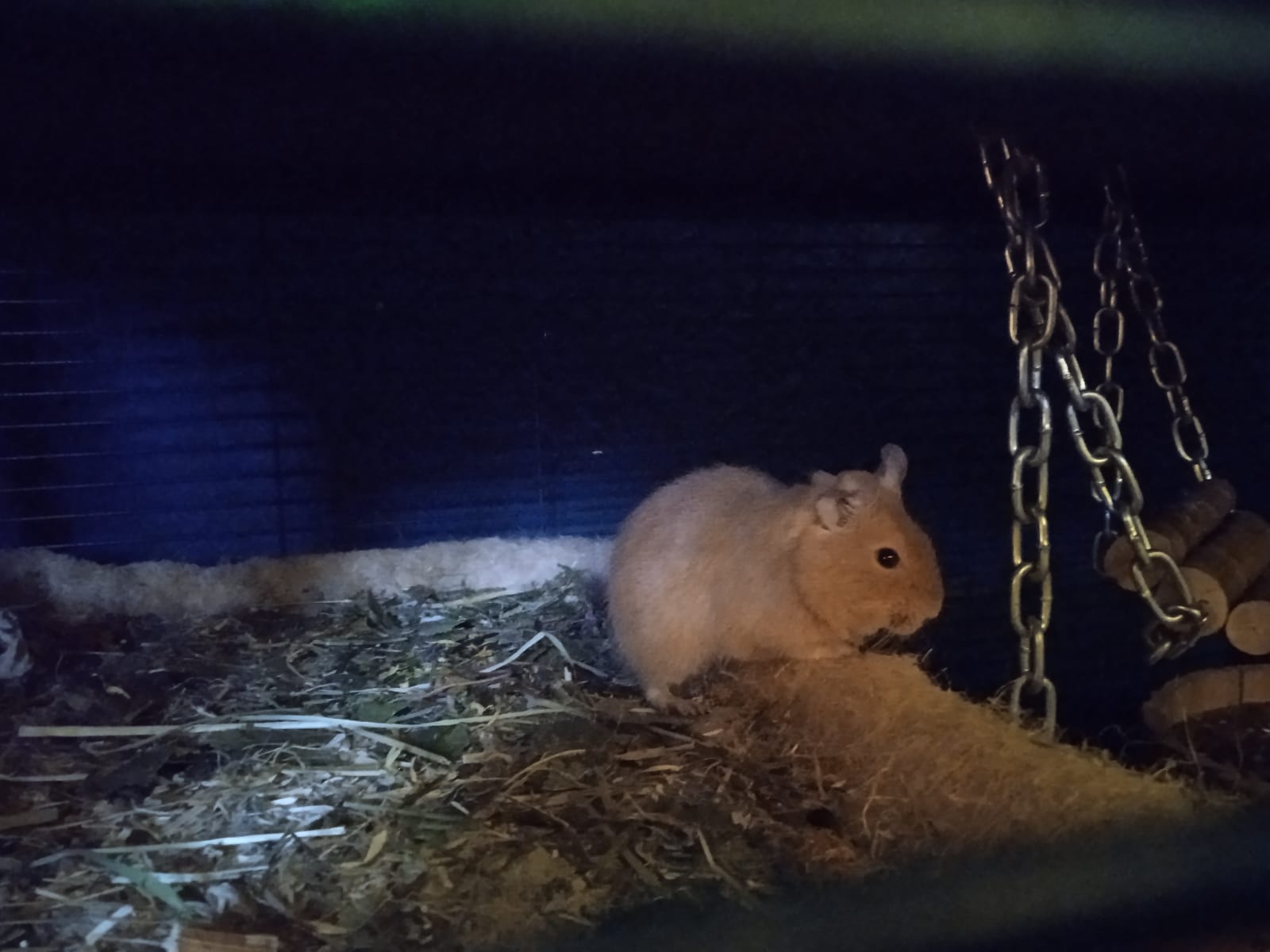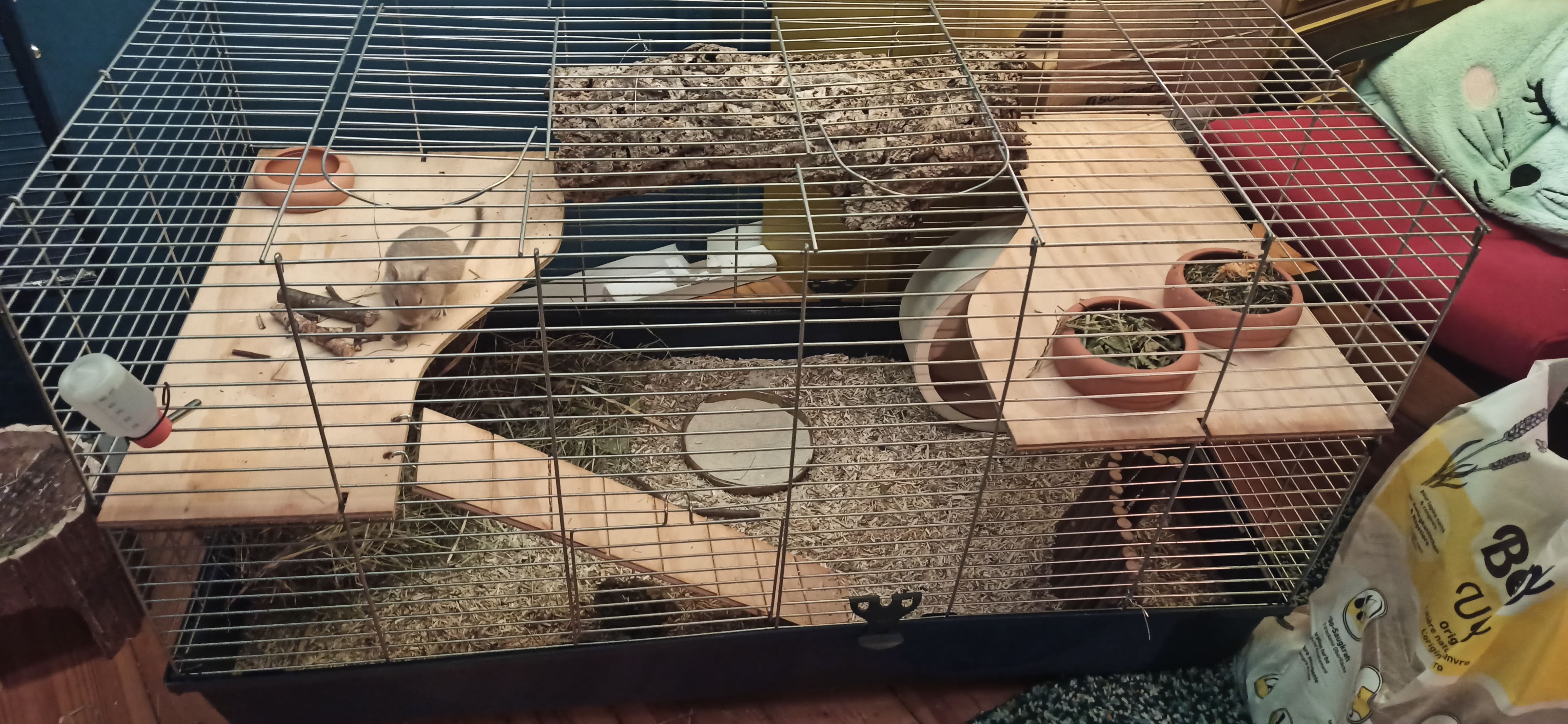 Auf die Schnelle haben wir einen Nagerkäfig besorgt, eingerichtet und vor allem mit Gerüchen von Oro versetzt. Ein Laufrad und Sandbad ist nun auch wieder drin. Es ist wesentlich mehr Platz für Oro als unten. Zuzüglich können wir die Käfige Gitter an Gitter stellen, sodass sie sich sehen, riechen und irgendwann auch mal beschnuppern können. Eine Trennwand können wir innerhalb von ein paar Sekunden dazwischen packen.